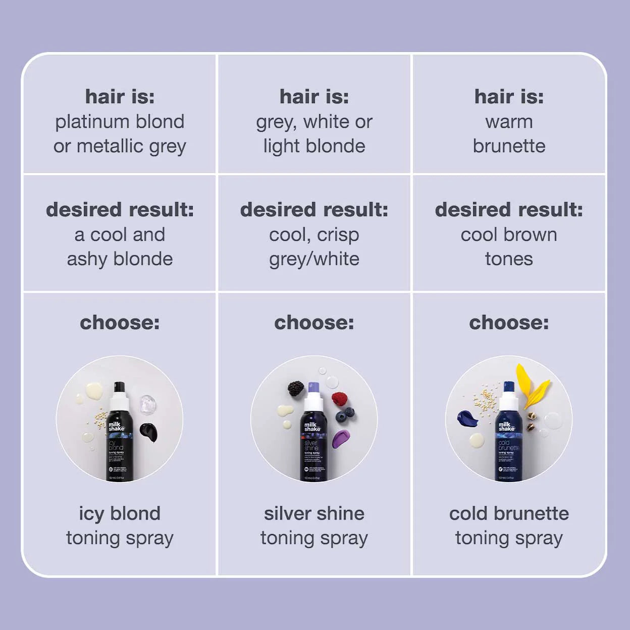 No-rinse, no problem. milk_shake silver shine toning spray uses violet pigments to mute unwanted brassy tones. With an extra sleek finish, milk proteins & organic berry extracts rehydrate strands for more manageable hair. This hair toning spray is perfect for the days when there's just no time for a wash. For more toning action, elevate wash day with silver shine shampoo & conditioner.